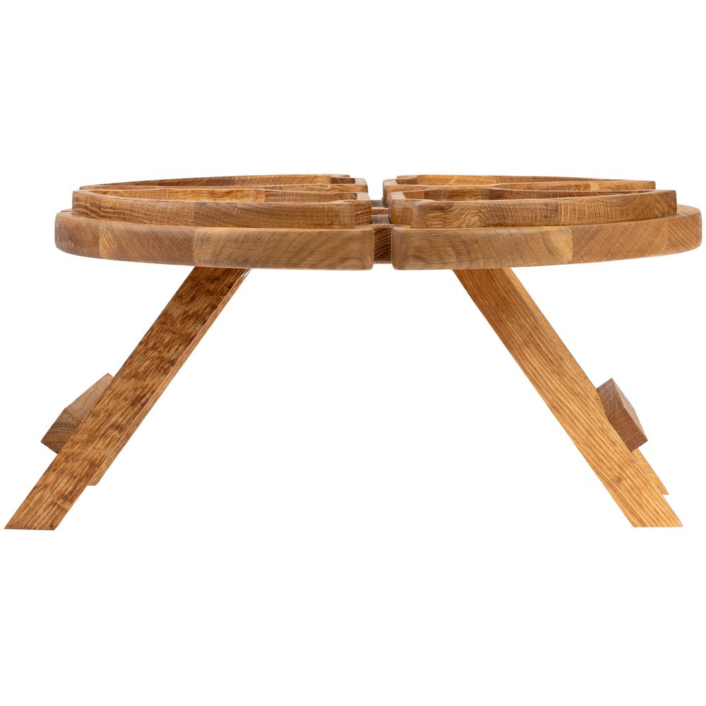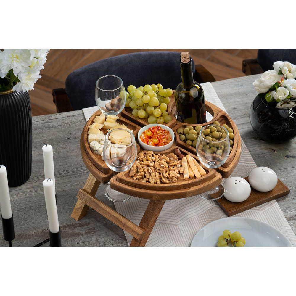 Ножки столика складываются — в сложенном виде его удобно брать с собой и на природу. Бутылка и бокалы надежно фиксируются на подносе, а сам стол, выполненный из натурального дерева, очень крепок и устойчив.