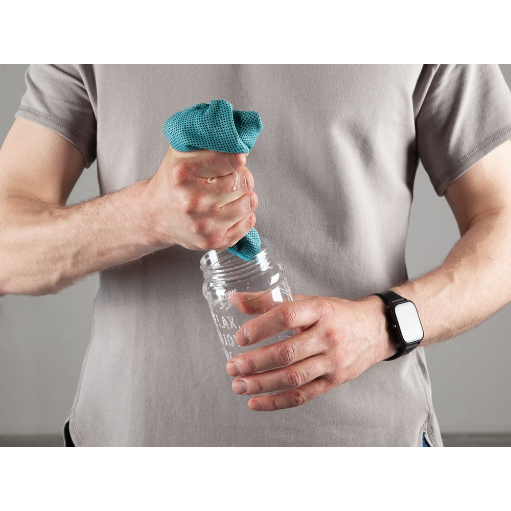 При хранении в бутылке полотенце сохранит охлаждающий эффект в течение нескольких часов. Благодаря крышке-карабину ее удобно прицепить на рюкзак или сумку.