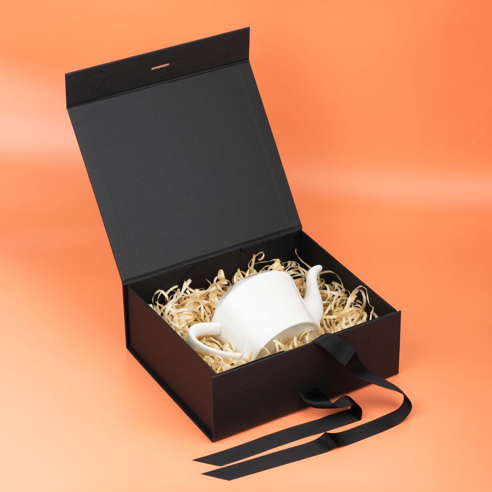 Коробка из переплетного картона, кашированного тонированной в массе крафтовой бумагой. Крышка на двух магнитах дополнительно фиксируется репсовой лентой.Толщина картона 2 мм.