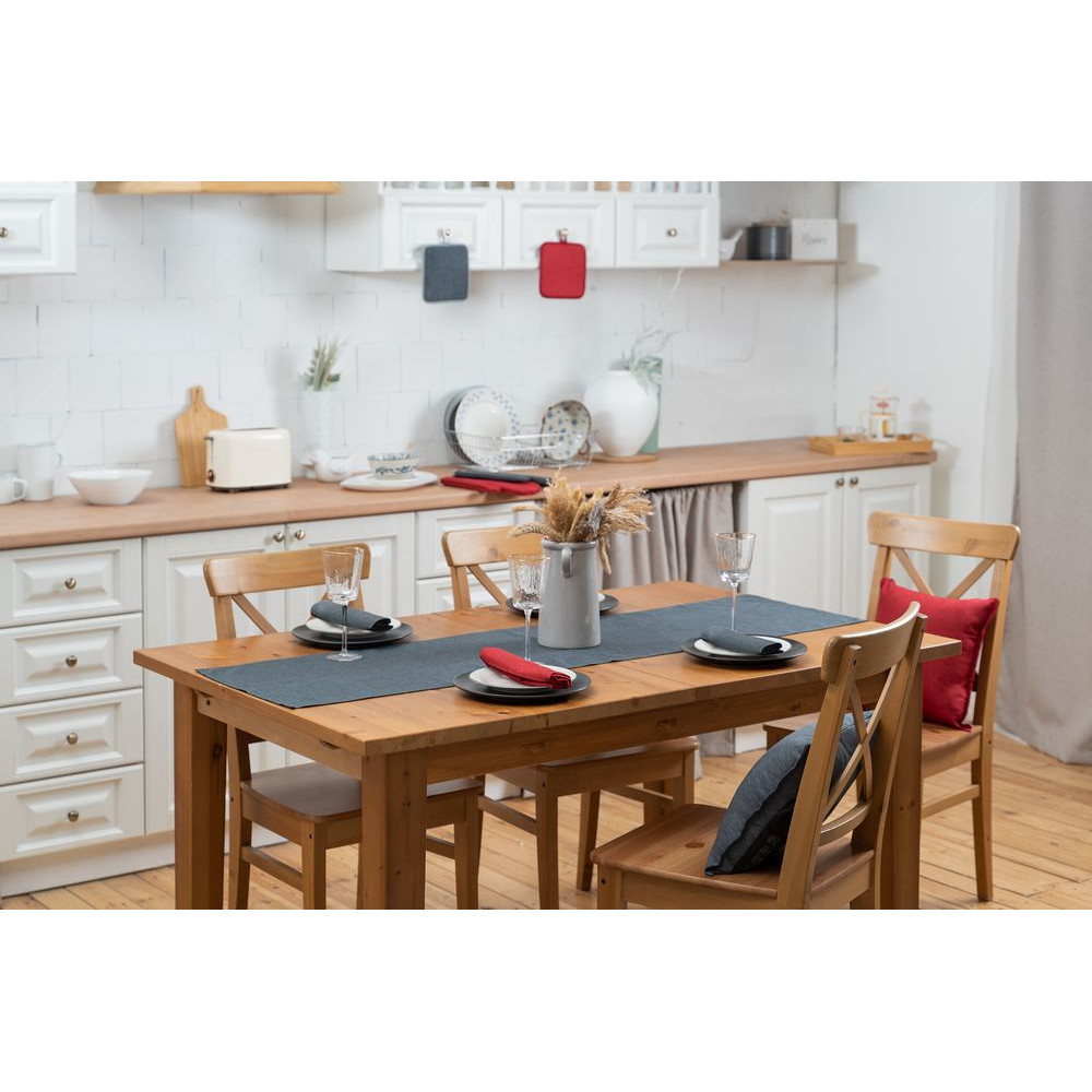 Износостойкая ткань, имитирующая лен, обработана пропиткой от грязи и воды, что делает ее применение для кухни и дома практичным, а уход — легким.