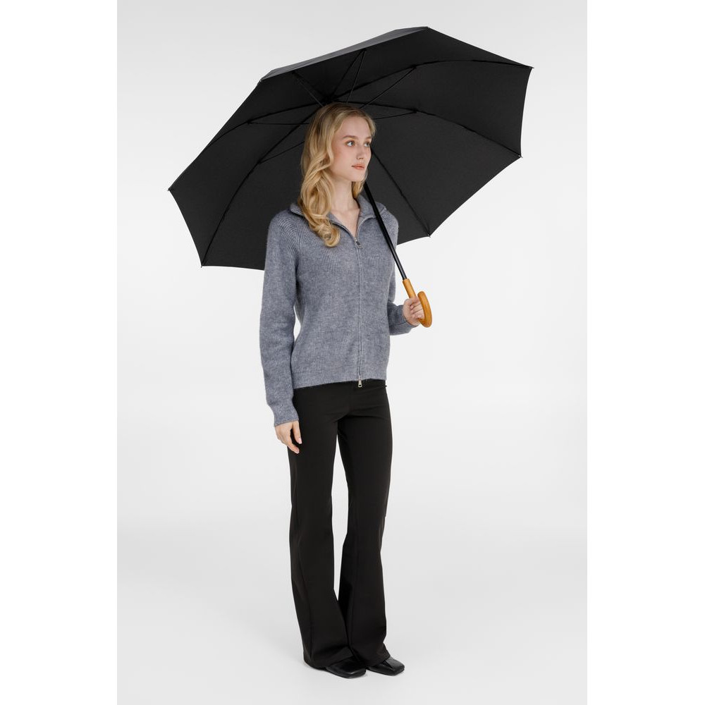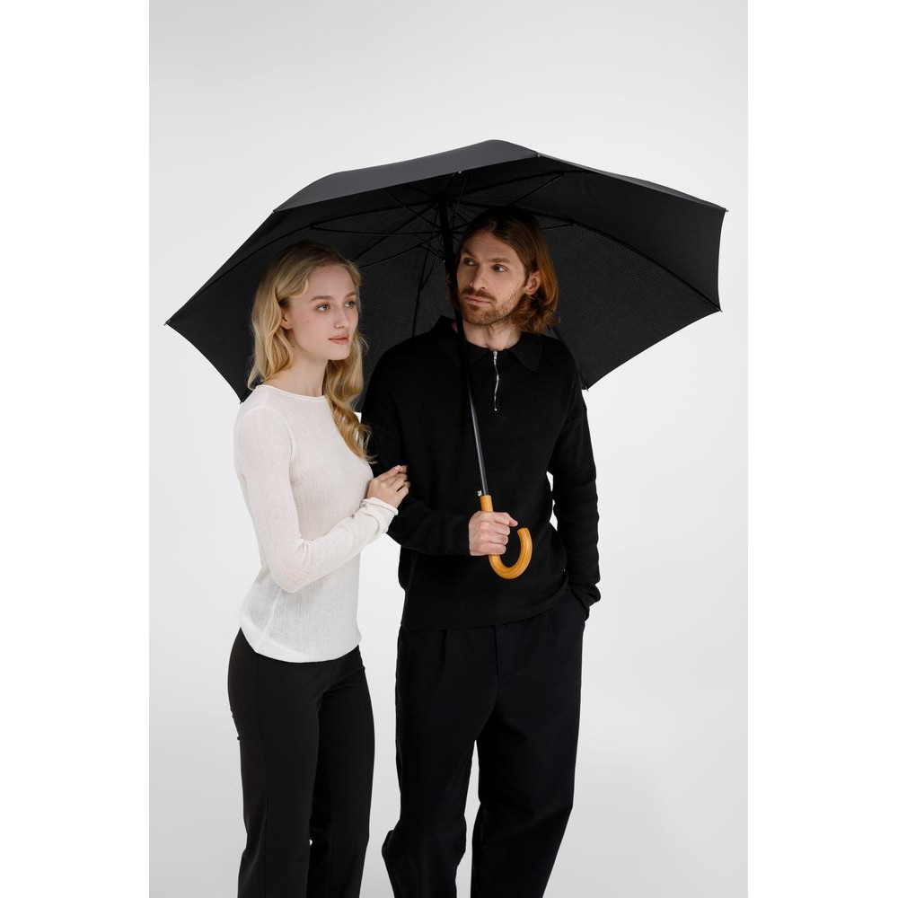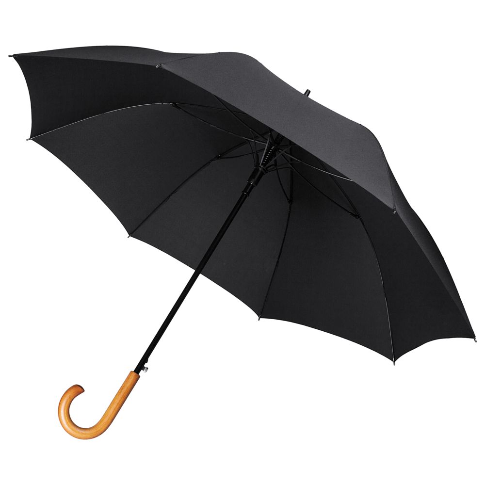 Элегантный зонт с большим куполом и деревянной J-образной ручкой.