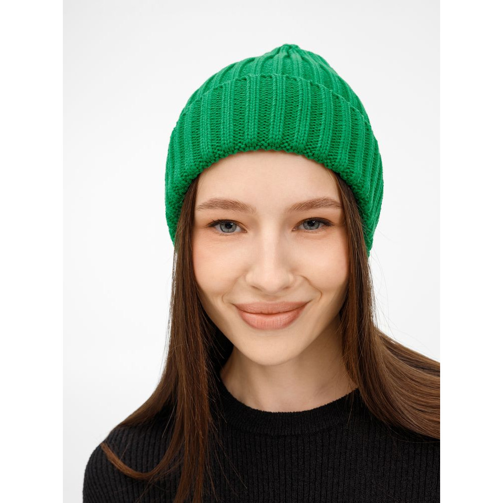 Однослойная шапка рельефной вязки с отворотом.