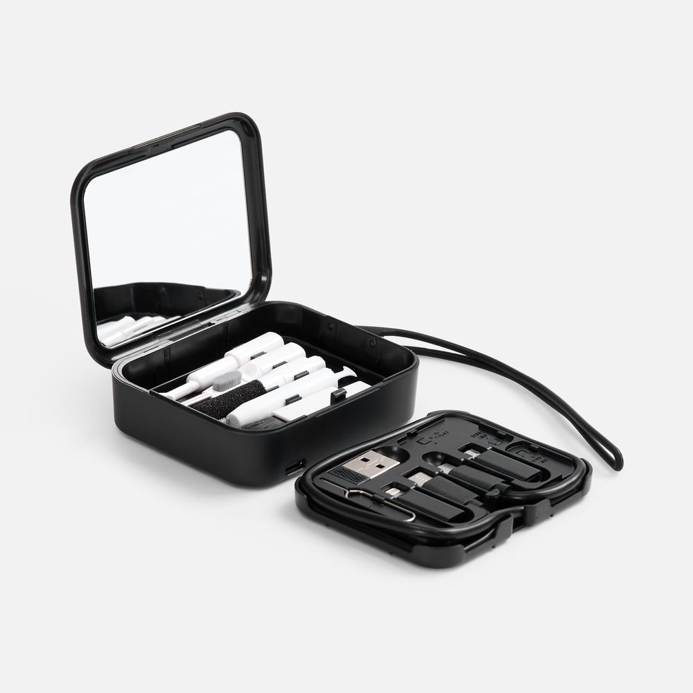 - аксессуары для чистки гаджетов: щетка с наклонной щетиной, перо для чистки со щеткой для наушников, насадка для чистки футляра от наушников, двусторонняя насадка для чистки разъемов зарядки, щетка с мягкой щетиной